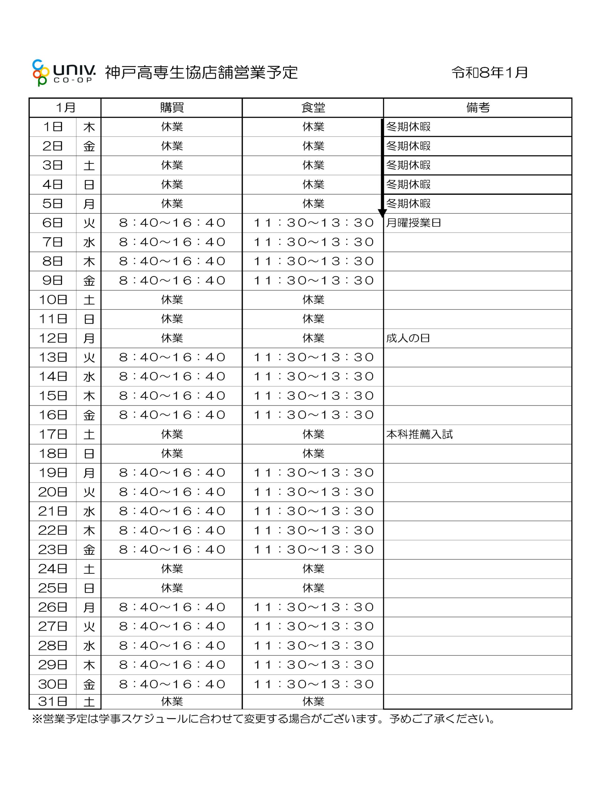 ※学校行事の変更により、営業日程を調整させて頂く場合がございます。