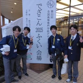 11月8日(土)、9日(日)に福井県鯖江市で開催された第22回全国高等専門学校デザインコンペティションにおいて、AMデザイン部門で優秀賞、プレデザコン部門で最優秀賞(AMデザインフィールド)と特別賞(創造デザインフィールド)を受賞しました。参加学生は皆2、3年生のため、来年の函館大会でも活躍が期待されます。