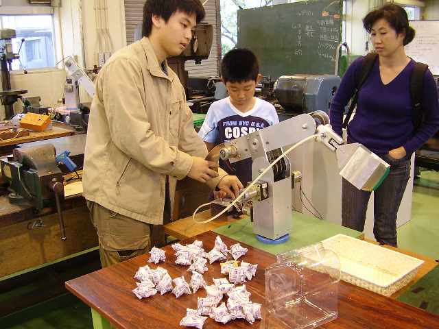 ロボットアームでアメちゃんをゲット キーホルダーを削っています