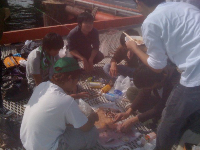 青空の下海釣り 包丁を持参その場で刺身に、、周到な準備?