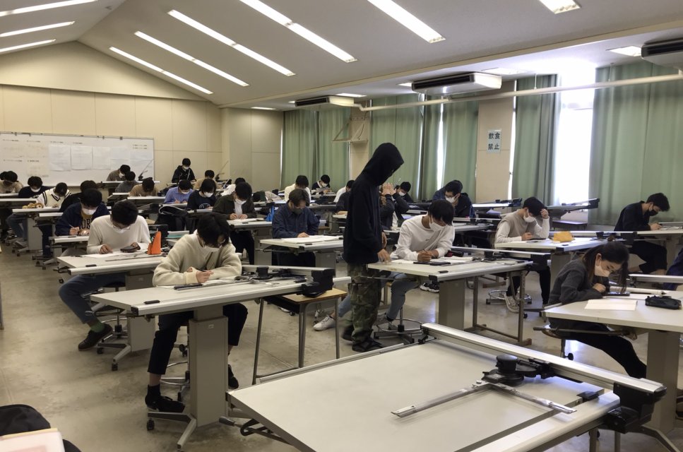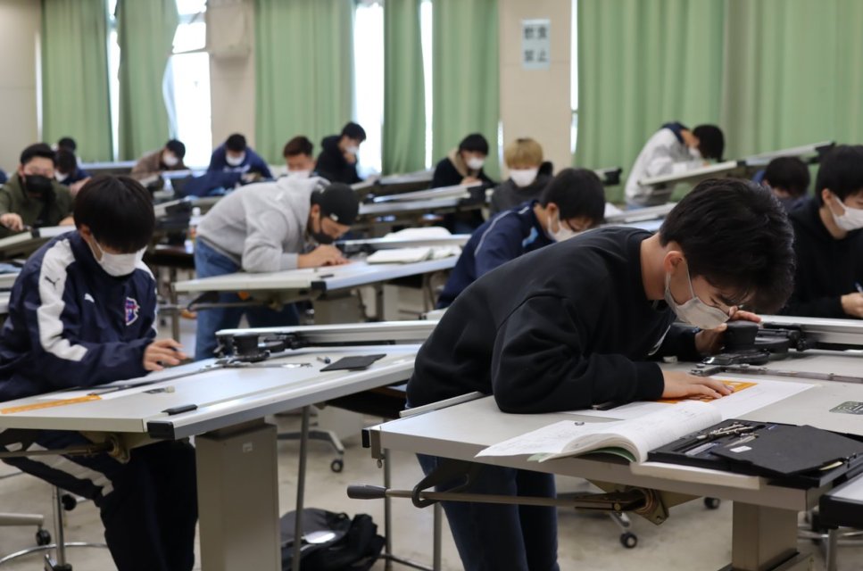設計製図授業風景(女子学生も図面とにらめっこ)