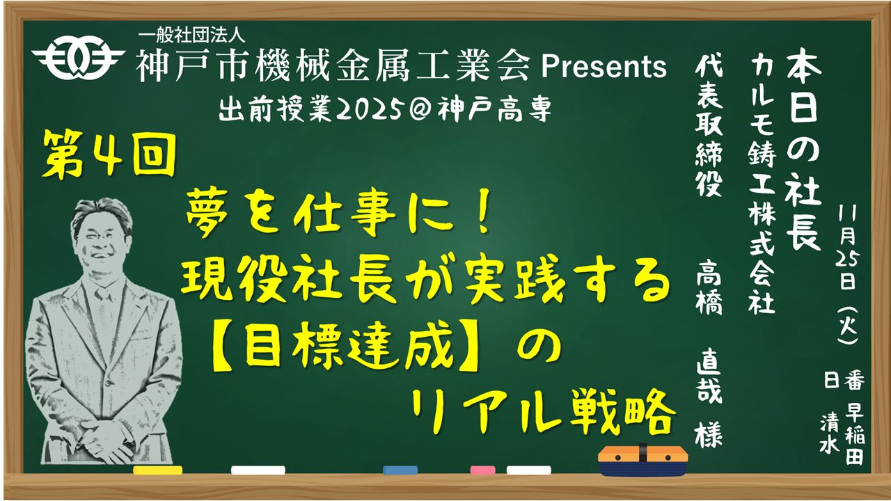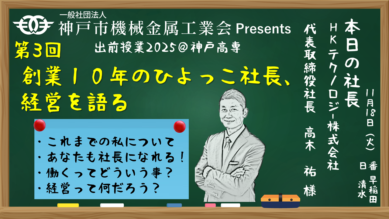 神戸市機械金属会所属企業の名物(?)社長たちの講話企画です。”どうして社長になったの?””会社を起業したきっかけは?””会社経営してみてのしくじりは?”など”ためになる!楽しい!面白い!”お話を提供していただいています。