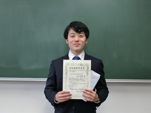 令和4年3月11日に開催された日本設計工学会関西支部令和3年度研究発表講演会 にて機械システム工学専攻2年江良 瑞樹さんが学生優秀発表賞を受賞しました。昨年度に引き続きオンラインでの開催となりましたが、大学生や大学院生も発表した中で見事な受賞でした。おめでとうございます。(2022年3月)