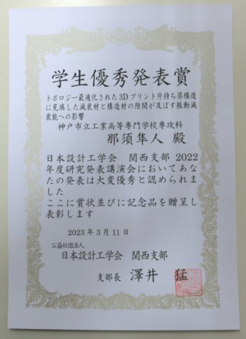 令和5年3月11日に開催された日本設計工学会関西支部2022年度研究発表講演会 にて機械システム工学専攻1年那須 隼人さんが学生優秀発表賞を受賞しました。今年度はハイブリッドでの開催(対面とオンライン)となりましたが、大学生や大学院生も発表した中で見事な受賞でした。おめでとうございます。(2023年3月)