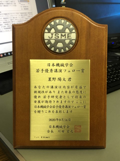 令和元年11月20日~22日に開催された日本機械学会第27回機械材料・機械加工技術講演会 にて「超音波による樹脂含侵測定における繊維形態の影響」というタイトルで発表した機械システム工学専攻 裏野 陽大さんが、若手優秀講演フェロー賞を受賞しました。裏野さん他5名が2019年度の受賞者となりましたが、受賞した学生のほとんどが大学院生であり、この中では最年少(専攻科1年生当時の発表なので大学3回生相当)での見事な受賞でした。表彰式は今年度9月年次大会の予定でしたが、新型コロナウィルスの関係で中止となり、今月に賞をたたえる盾が届きました。おめでとうございます。(2020年10月)。