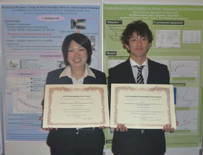 11月3-5日に大阪(関西空港会議場)で開催された国際会議「6th ISEM'11」 (International Symposium on Advanced Science and Technology in Experimental Mechanics)のポスターセッションにおいて、機械システム工学専攻1年の新海さん(赤対・鈴木研究室)が優秀賞を、高島さん(吉本研究室)が奨励賞を受賞しました。優秀賞は昨年度に引き続き2年連続の受賞になり、本年度も最も高い評価を頂きました(2011年11月)。