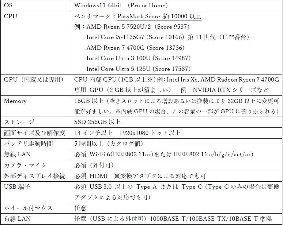 新規購入と比べて性能が低い場合、CPUベンチマーク:PassMark Score 3000相当(例Intel Core i5-6200U(第6世代(6000番台))、 AMD Athlon Silver 3050U) / Memory:8GB(16GBが望ましい) / ストレージ SSD 256GB / Wi-Fi 5(IEEE802.11ac)またはIEEE 802.11 a/b/g/n/ac/ HDMI / USB 3.0 以上 / バッテリ駆動時間5時間以上(カタログ値)が最低条件となります。