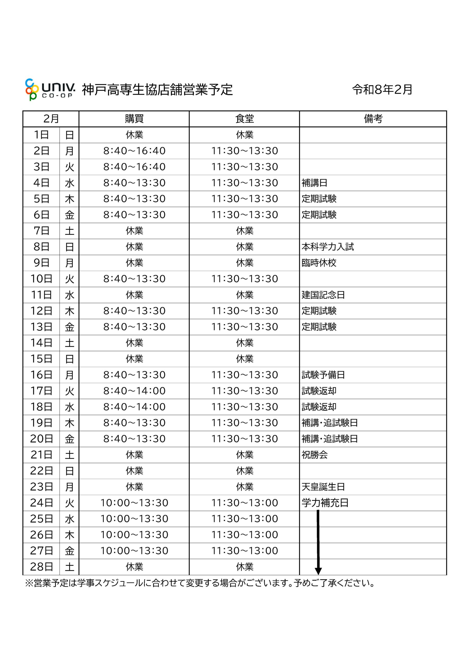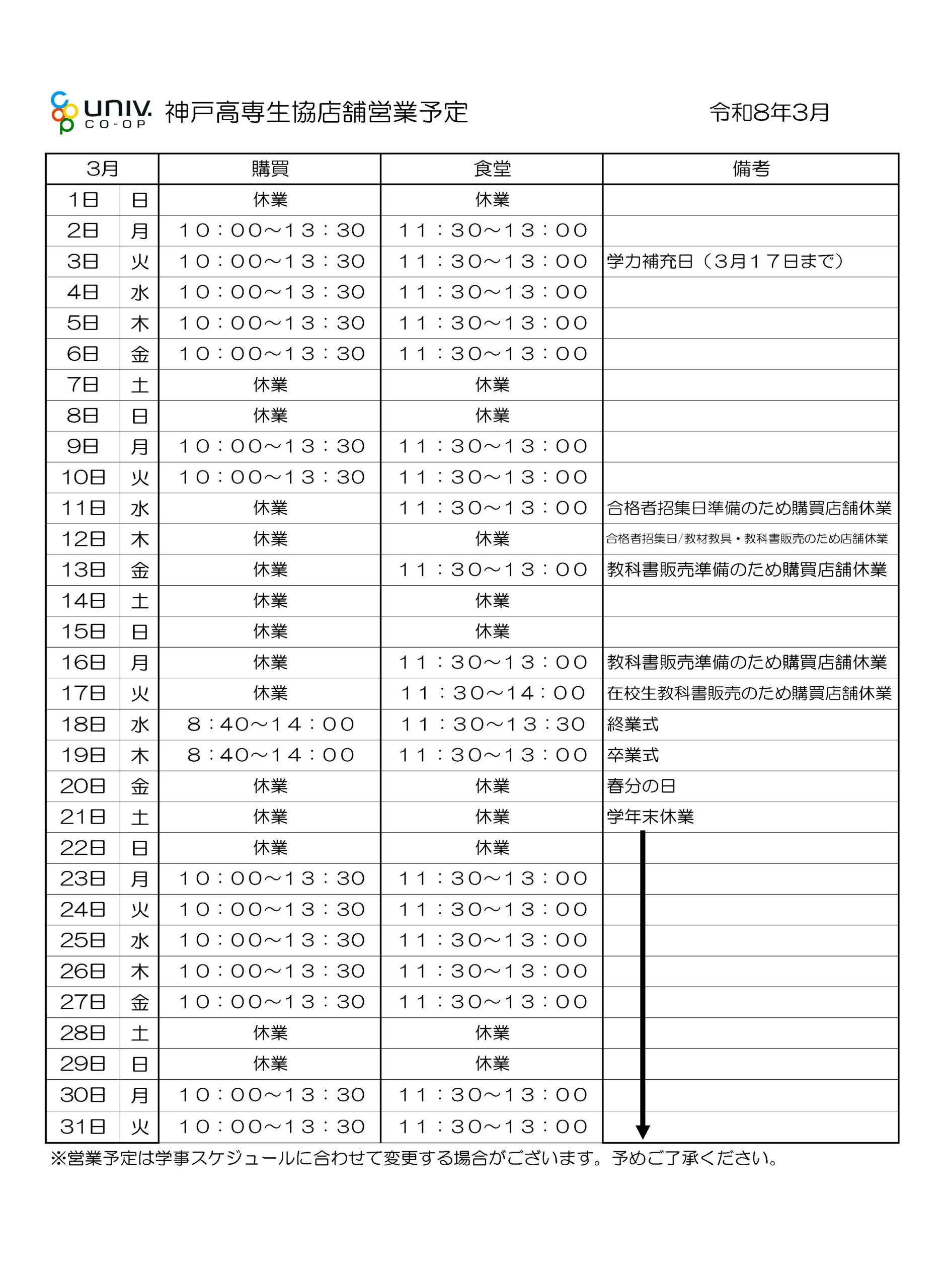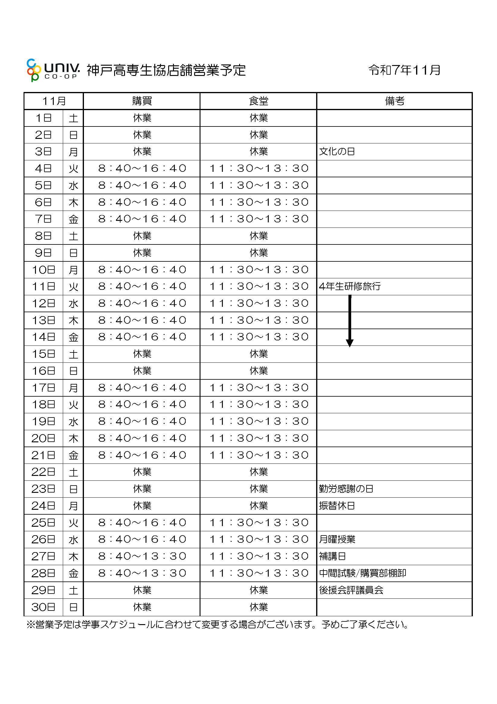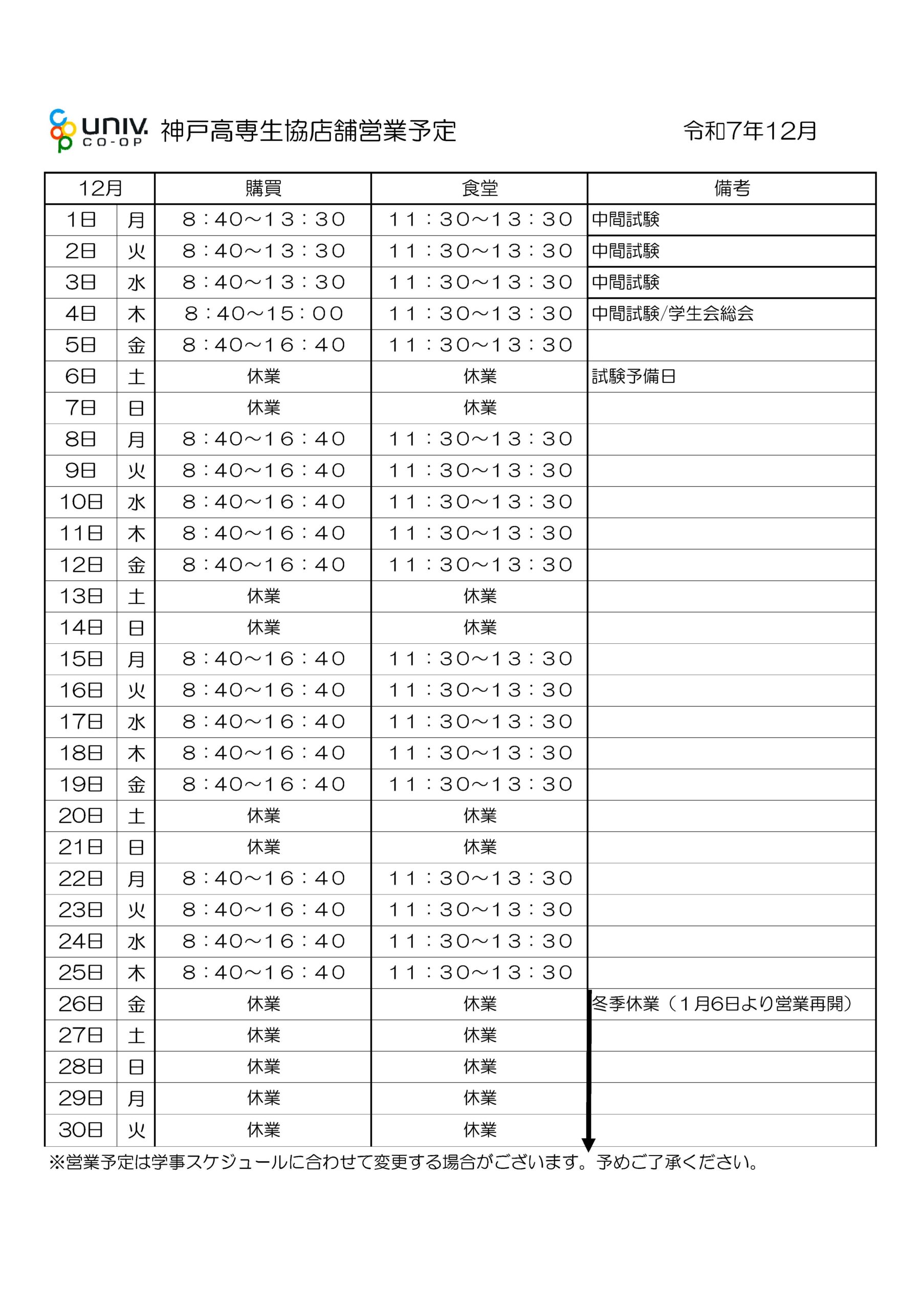 ※学校行事の変更により、営業日程を調整させて頂く場合がございます。